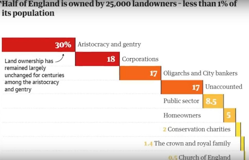 I don’t remember where I found it but it looks like well over 70% of the land in England is in the known hands just split between 3 groups of cousins: aristocracy, corporations, oligarchs & bankers. This 17% of unaccounted land is also interesting. The UK government will go after every of your pennies but cannot keep track of 17% of the land of England to tax it?